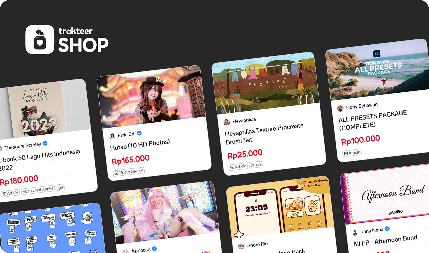 Tak terbatas jarak dan format, di Trakteer Shop, Kreator bisa menjual berbagai macam produk digital dalam hitungan detik dan sekali klik!
